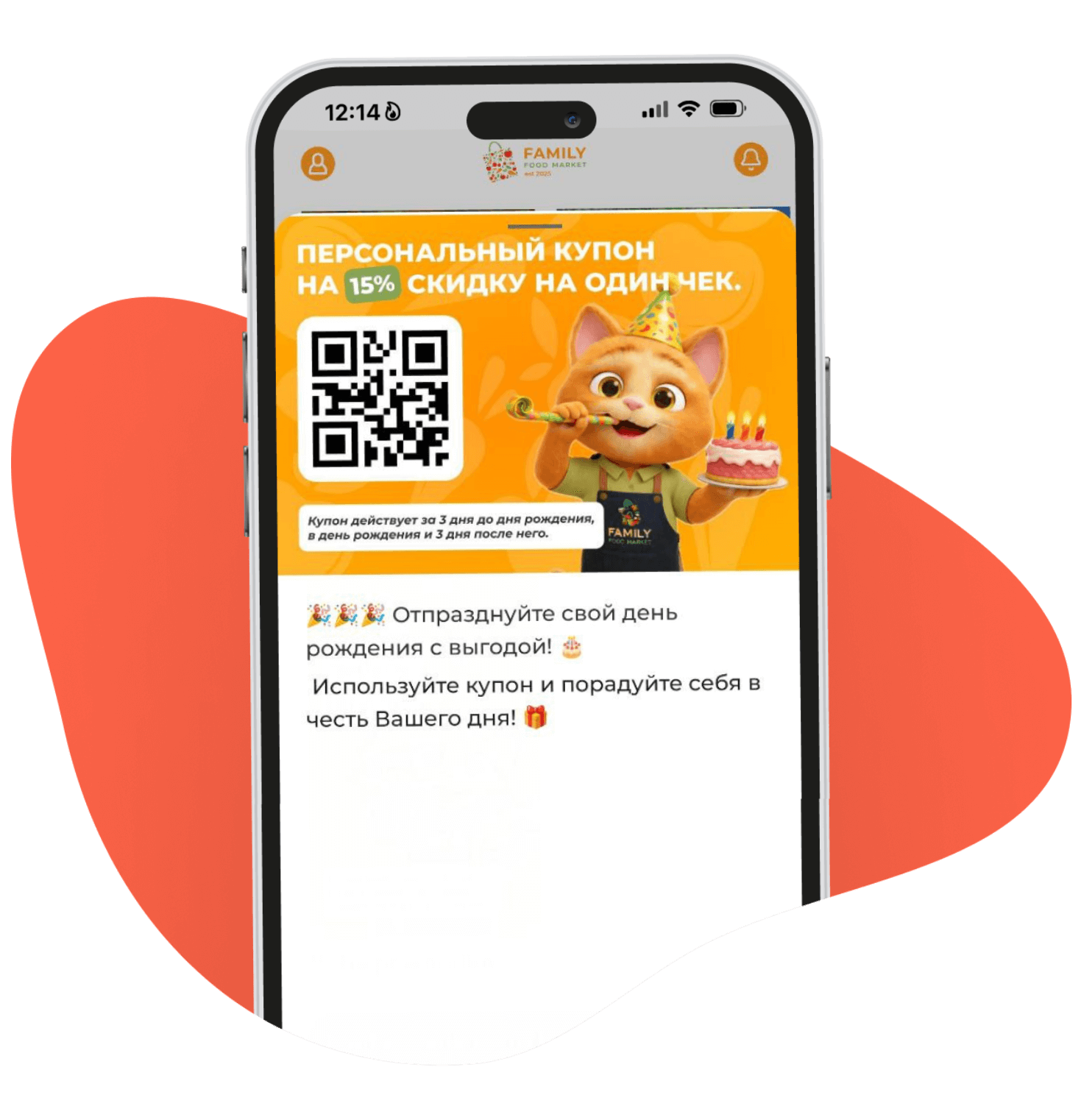 Персональный купон на 15% скидку на один чек: действует за 3 дня до, в день и 3 дня после дня рождения.
